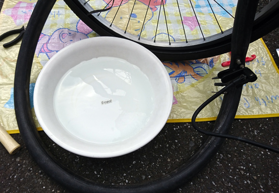 パンクした箇所を捜すのに、水を入れた洗面器を使用します。